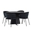 Modernes 5-teiliges Esszimmer-Set mit rundem Bootcut-Tisch (Ø110 cm) und luxuriösen Selma-Stühlen aus schwarzem Samt – stilvoll, elegant und komfortabel. Lesen Sie mehr.