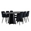 7-teiliges Esszimmer-Set mit ovalem Bootcut-Tisch (230 × 115 cm) in Schwarz und sechs gepolsterten Night-Stühlen mit schwarzem Samtbezug – modernes Design trifft luxuriösen Komfort. Lesen Sie mehr.