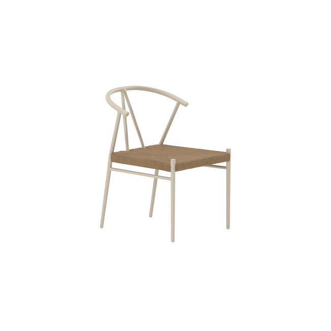 Eleganter Alfons Dining-Sessel in Beige. Harmonische Kombination aus hellem Stahlgestell und warmem Rattan-Geflecht. Stapelbar, ergonomisch geformt und zeitlos – die perfekte Balance zwischen Funktion und skandinavischem Design. Lesen Sie mehr.