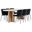 Essgruppe 7-tlg. mit großem Bootcut-Esstisch (230 x 115 cm) in Natur und 6 Modesto-Stühlen mit schwarzem Teddy-Polyesterbezug und Stahlgestell. Modern, komfortabel und ideal für gesellige Runden. Lesen Sie mehr.