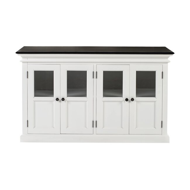 ↔ 145 cm ↕ 85 cm – Der viertürige Buffetschrank mit abgeschrägten Glastüren vereint französischen Landschaftscharme mit Ostseeküste-Robustheit. Handgefertigt aus Mahagoni/MDF, Weiß/Schwarz Distressed, antike Messingbeschläge – komplett montiert. Lesen Sie mehr.