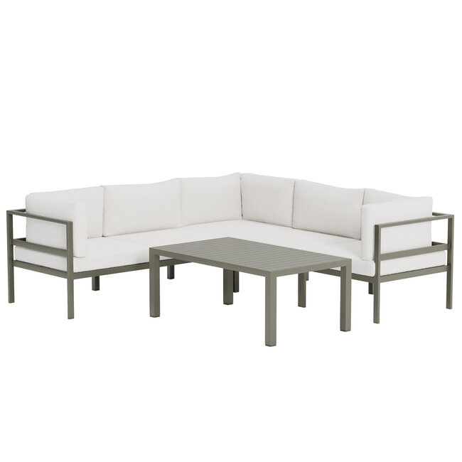 Exklusive Copacabana Ecklounge im 3+2 Layout. Edles braunes Aluminium-Gestell kombiniert mit weißen Bouclé-Polstern. Inklusive großem Loungetisch (120x70 cm). Wetterfest, luxuriös und mit dem Komfort eines Indoor-Wohnzimmers für Ihren Außenbereich. Lesen Sie mehr.