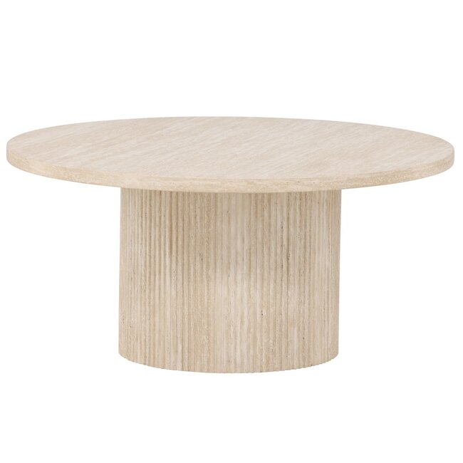 Eleganter runder Couchtisch Härön (Ø 80 cm) in zeitlosem Beige. Hochwertiges MDF-Finish in täuschend echter 3D-Travertin-Optik. Kompaktes Design (Höhe 38 cm), belastbar bis 60 kg. Perfekt für ein helles, modernes Wohnambiente. Lesen Sie mehr.