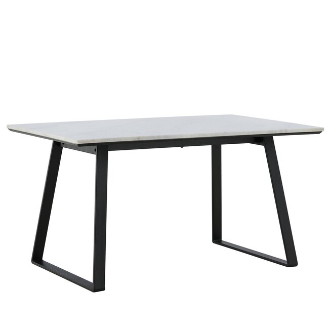 Die Tischplatte besticht durch wunderschönen, weiß/grauen Marmor – jedes Stück ist ein Unikat. Das stabile Gestell besteht aus schwarz pulverbeschichtetem Metall (Stahl), was einen modernen Kontrast zur edlen Steinoberfläche bildet.