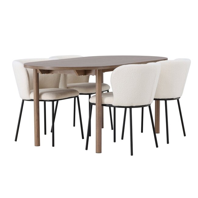 Skandinavisches 5-tlg. Esszimmer-Set mit ovalem Andy Esstisch (180x90 cm) in Holzoptik und eleganten Edina Stühlen in weißem Bouclé. Modern, komfortabel und zeitlos für stilvolle Essbereiche. Lesen Sie mehr.