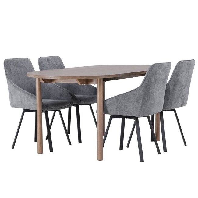 Essgruppe Andy mit ovalem Tisch (180x90 cm) in Holzoptik und Rosie Stühlen in Grau. Skandinavisches Design, hoher Komfort und zeitlose Eleganz für Ihr Esszimmer. Lesen Sie mehr.
