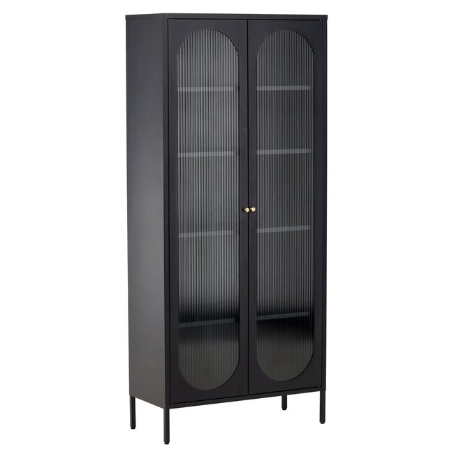 ↕ 180 cm – Eleganter Stahlschrank Lima in Schwarz mit vier Regalböden und zwei Türen aus stilvollem gewelltem Glas.