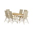 Exklusive Panama Essgruppe aus beigem Aluminium und hochwertigem Teakholz. Set bestehend aus einem ausziehbaren Esstisch (160–240 cm) und 6 verstellbaren Klappsesseln. Wetterfest, elegant und flexibel für bis zu 10 Personen. Lesen Sie mehr.