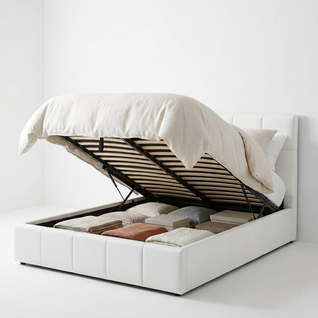Diskret verborgener Stauraum: Der integrierte Bettkasten unter der Liegefläche bietet massiven Platz für Bettwäsche, Winterdecken oder Kissen. Dank stabiler Gasdruckfedern lässt sich die Liegefläche ohne Kraftaufwand mühelos anheben.