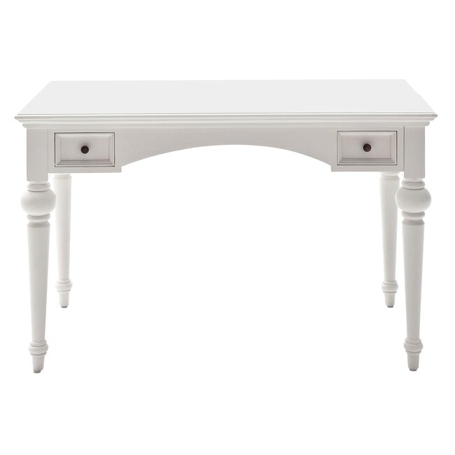 ↔ 120x70 cm – Eleganter Provence Schreibtisch aus massivem Mahagoni mit edlem Classic White Finish, zwei praktischen Schubladen und antiken Messingbeschlägen.