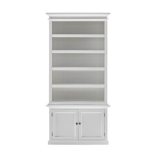 ↔ 112 cm ↕ 230 cm – Eleganter Halifax Buffetschrank aus massivem Mahagoni mit 5 offenen Regalfächern & blickdichtem Stauraum unten. Klassisches weißes Finish mit Messingbeschlägen – ideal für schmalere Wände, teilmontiert geliefert. Lesen Sie mehr.