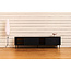 Der Tisch ist aus hochwertigem und langlebigem Eichenfurnier oder Birkensperrholz, ölgewachst. Die Schiebetüren laufen auf Häfele-Laufrollen. Schwarz pulverbeschichtete Metallbeine mit einer Höhe von 17 cm. Oder auf Wunsch als wandhängende Variante – durch eine starke Rückwand können Sie sie mit Schrauben an der Wand befestigen.