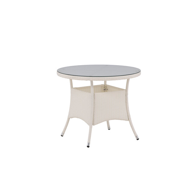 Runder Gartentisch Volta mit Ø 90 cm. Elegante Glasplatte trifft auf ein robustes Untergestell aus weißem Polyrattan. Wetterfest, UV-beständig und ideal für kleine Terrassen oder Balkone. Genießen Sie Dinner-Highlights ohne Ecken und Kanten! Lesen Sie mehr.